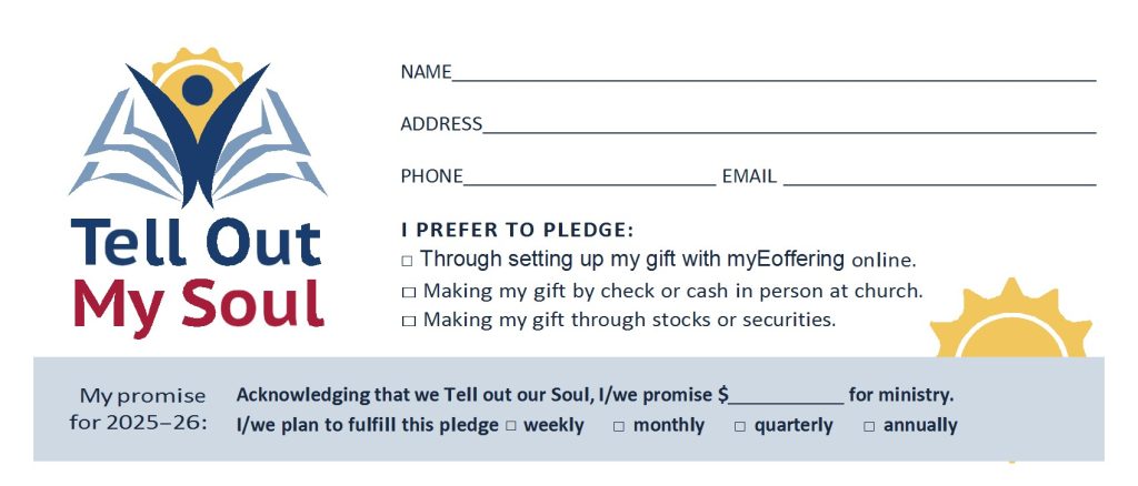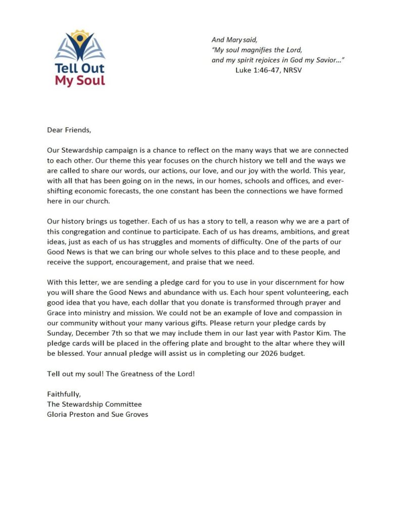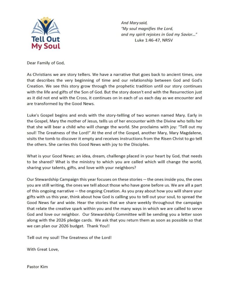The Gospel invites us to Tell Out My Soul with our neighbor in their footsteps, with the outcast and the marginalized, with those who need us. As we spread the Good News in our world, we carry the love and support of our congregation and our prayers into our communities. When you share your many gifts with your neighbors, every step is the Greatness of the Lord!!
